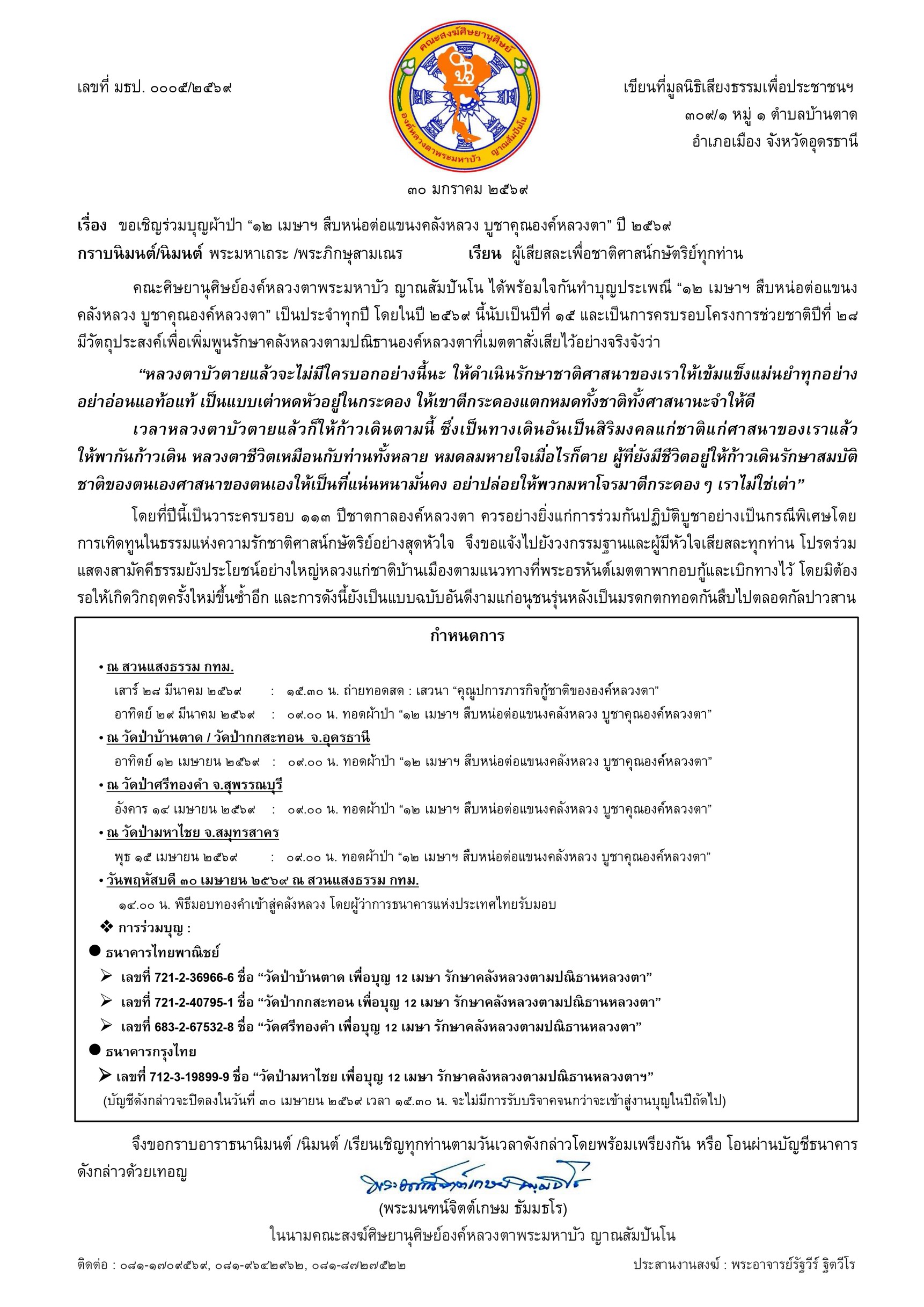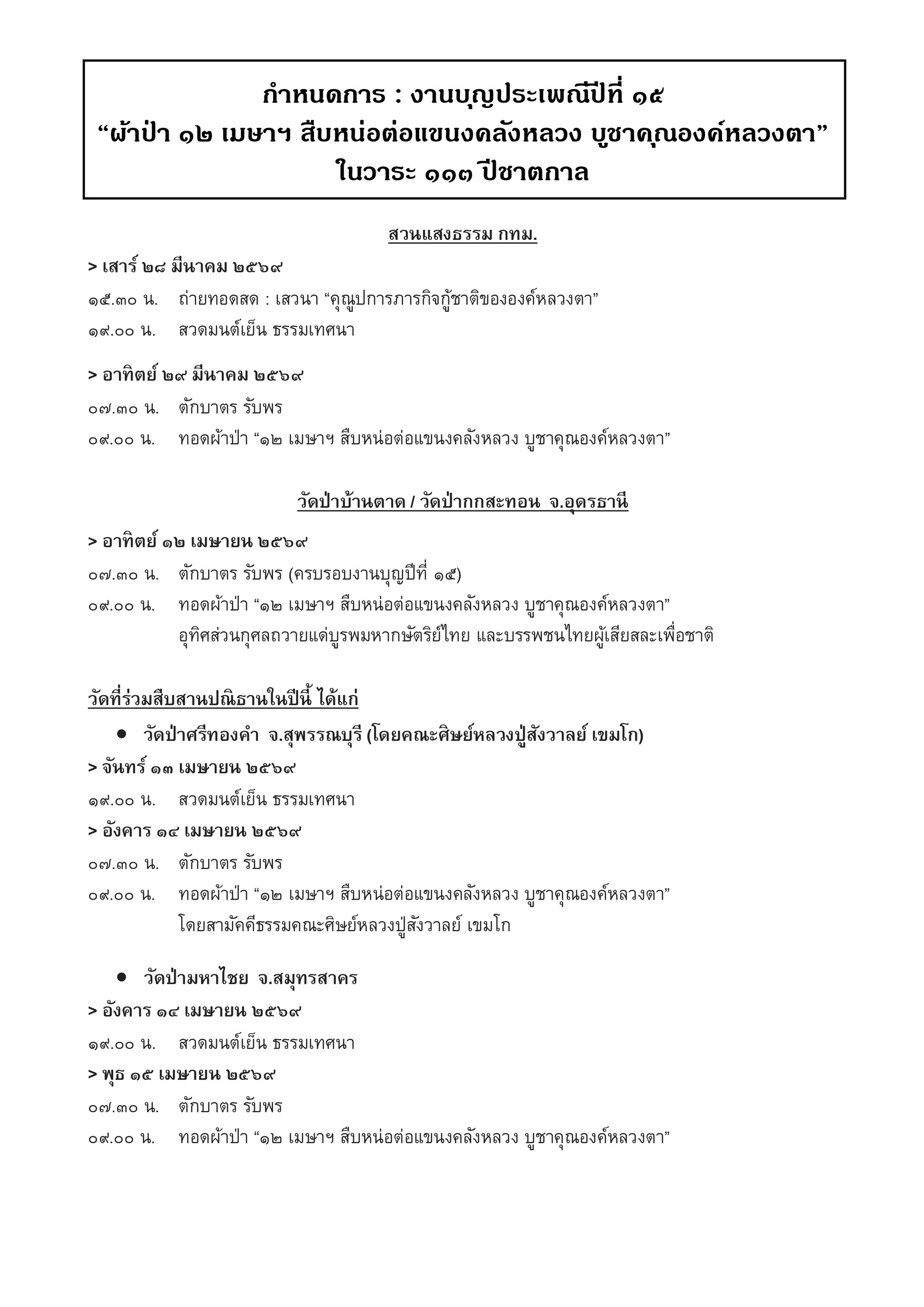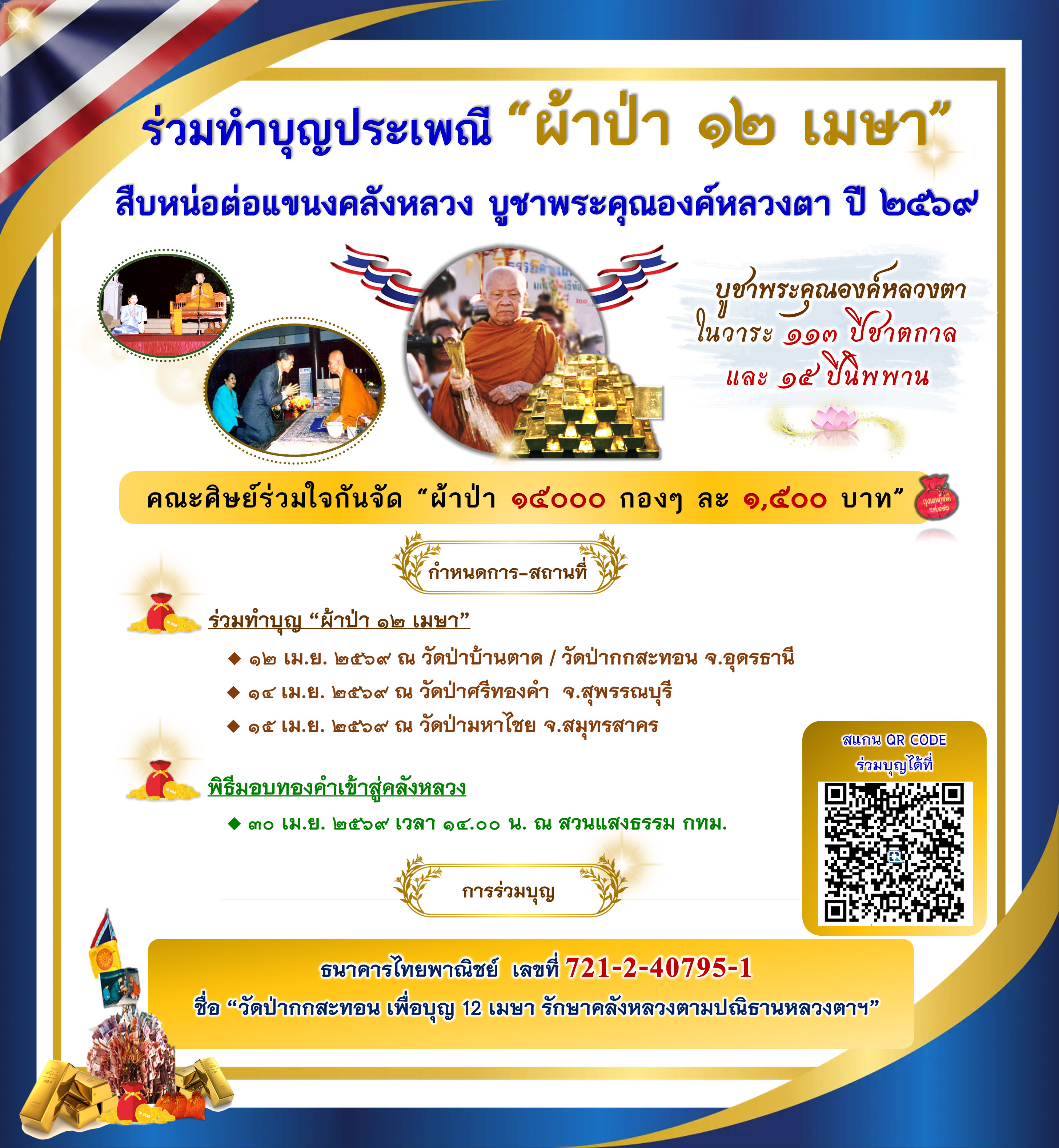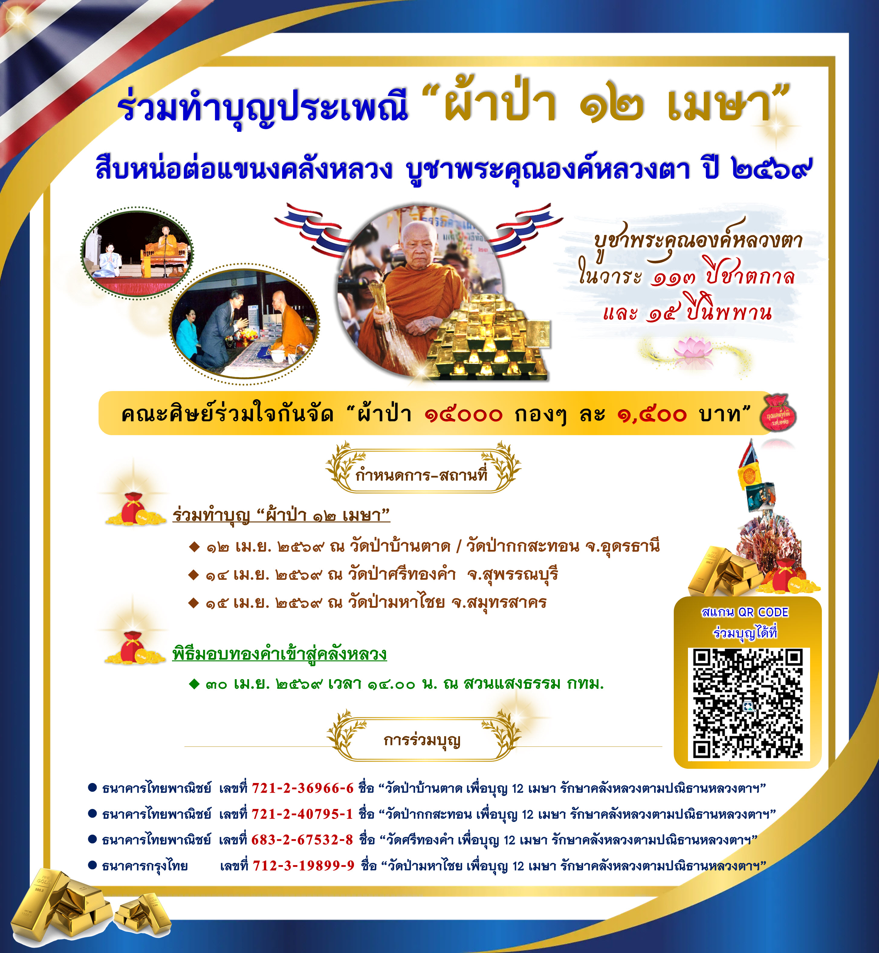 | งานบุญประเพณีปีที่ ๑๕ "ผ้าป่า ๑๒ เมษาฯ สืบหน่อต่อแขนงคลังหลวง บูชาคุณองค์หลวงตา" ในวาระ ๑๑๓ ปีชาตกาล |